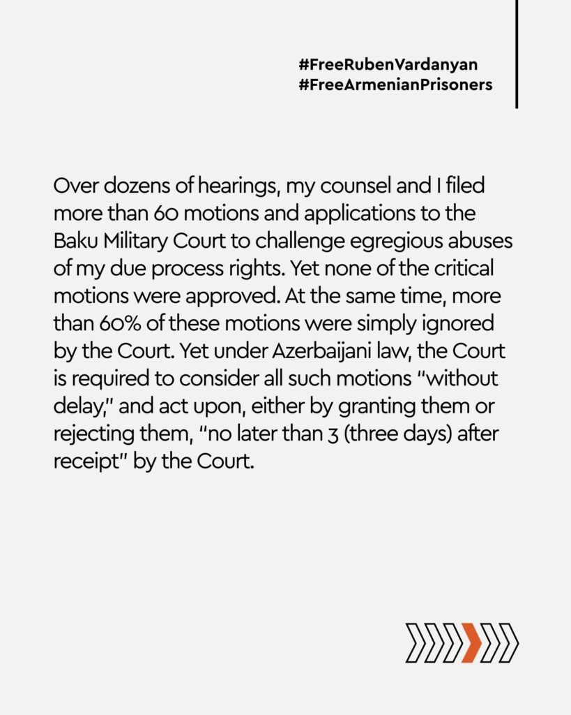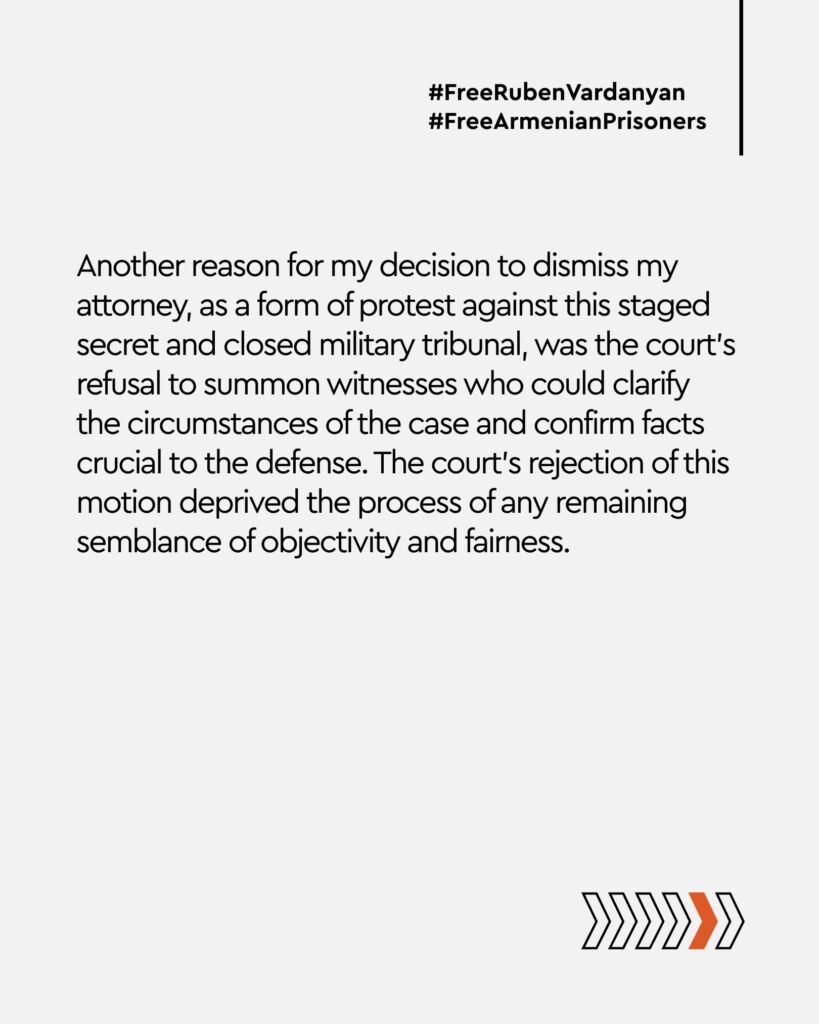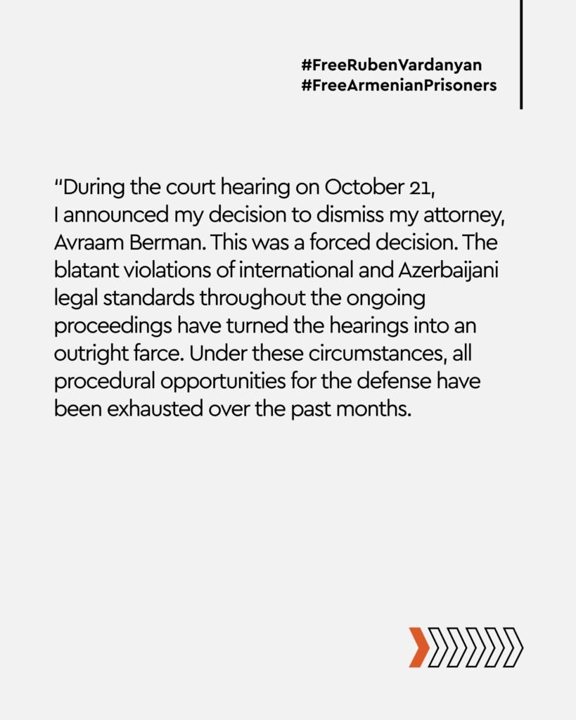 “During the court hearing on October 21, I announced that I was refusing the services of my lawyer, Avraam Berman. This decision was forced. The gross violations of international and Azerbaijani judicial norms throughout the current proceedings have turned the hearings into an outright farce. Under these conditions, all procedural possibilities for defense have been exhausted over the past months.