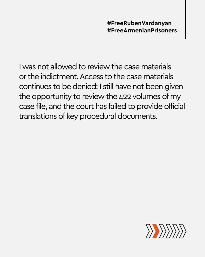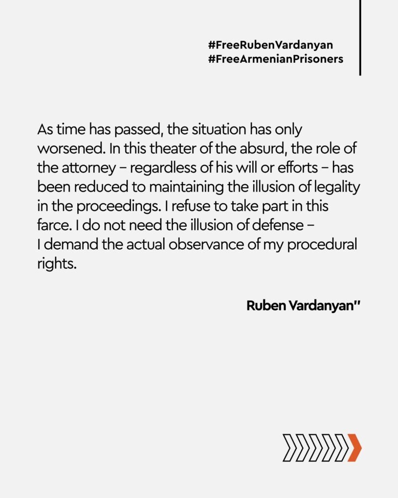 Armenian philanthropist and former Artsakh State Minister Ruben Vardanyan has refused legal defense in the ongoing court proceedings against him in Azerbaijan, citing violations of international and domestic legal standards.