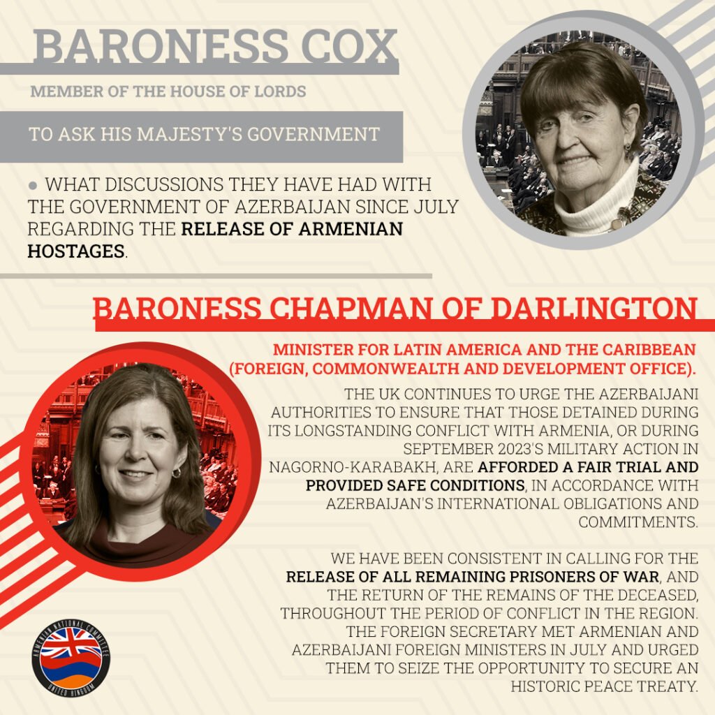 In a related matter, on 7 October 2024, Baroness Cox, Crossbench, asked “His Majesty’s Government what discussions they have had with the government of Azerbaijan since July regarding the release of Armenian hostages.”