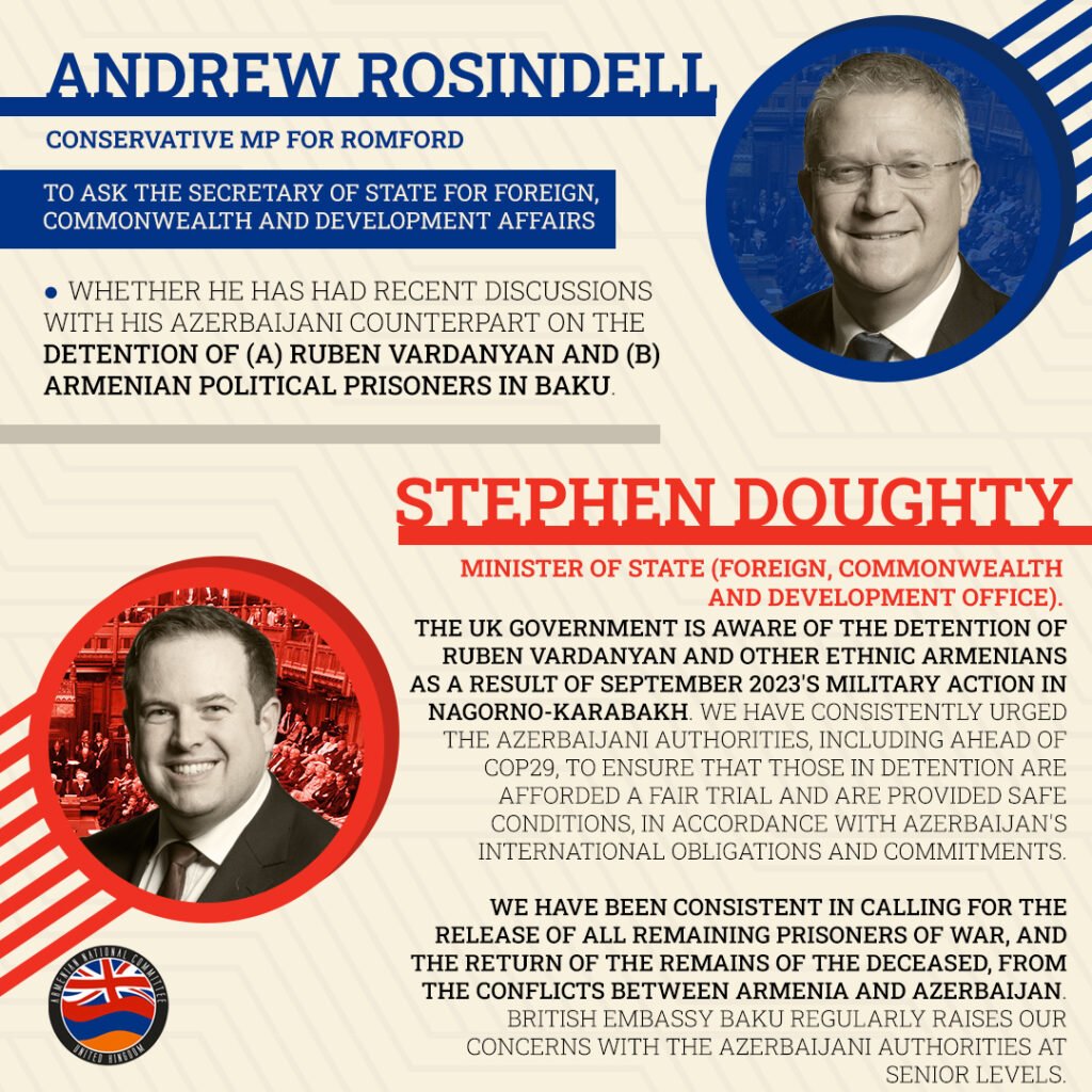 Andrew Rosindell, Conservative MP for Romford in the U.K. House of Commons in a written question to the Foreign, Commonwealth and Development Office on 4 October 2024 asked: “To ask the Secretary of State for Foreign, Commonwealth and Development Affairs, whether he has had recent discussions with his Azerbaijani counterpart on the detention of (a) Ruben Vardanyan and (b) Armenian political prisoners in Baku.”