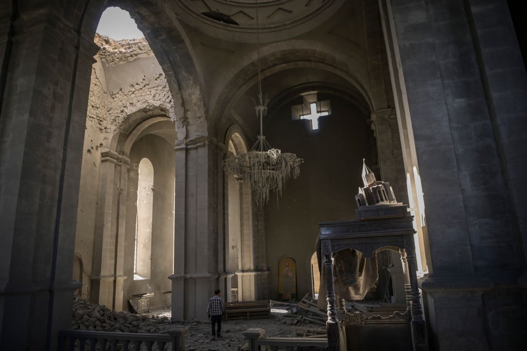Pictured: The Ghazanchetsots Cathedral in Shusha, Artsakh (Nagorno-Karabakh) on October 13, 2020, after it was bombed by Azerbaijani forces. (Photo by Aris Messinis/AFP via Getty Images)