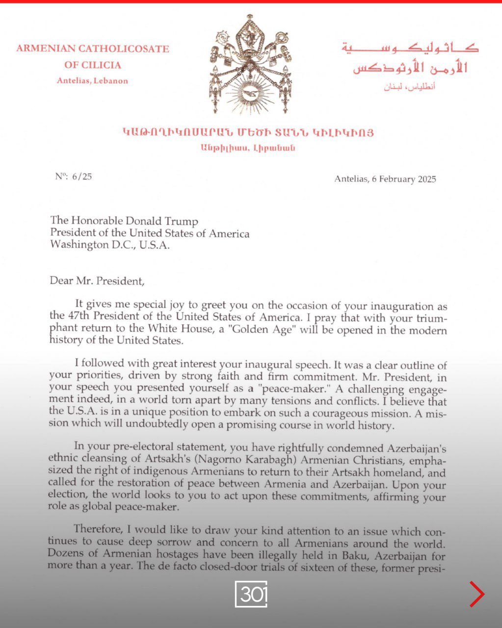 In his letter, dated February 6, 2025, Aram I congratulated Trump on his inauguration and acknowledged his commitment to global peace. He referenced Trump’s previous statements condemning Azerbaijan’s ethnic cleansing of Artsakh’s Armenian population and his support for the return of indigenous Armenians to their homeland..