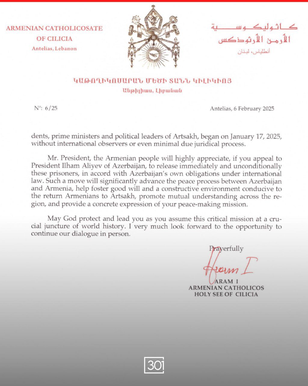 BREAKING: His Holiness Aram I, Catholicos of the Great House of Cilicia, has sent a letter to U.S. President Donald Trump, urging him to take action regarding the Armenian prisoners illegally held in Azerbaijan.