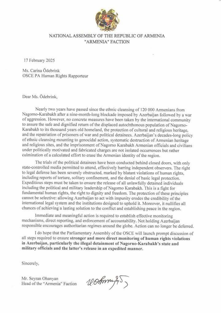 The opposition “Hayastan” (Armenia) Faction of the Armenian Parliament has sent letters to the President of the OSCE PA, the rapporteurs on human rights and South Caucasus issues, demanding immediate steps to organize a fact-finding mission to monitor the trials of Armenian prisoners of war held in Baku and the military-political leadership of Nagorno-Karabakh, faction leader Seyran Ohanyan said in a statement on social media.